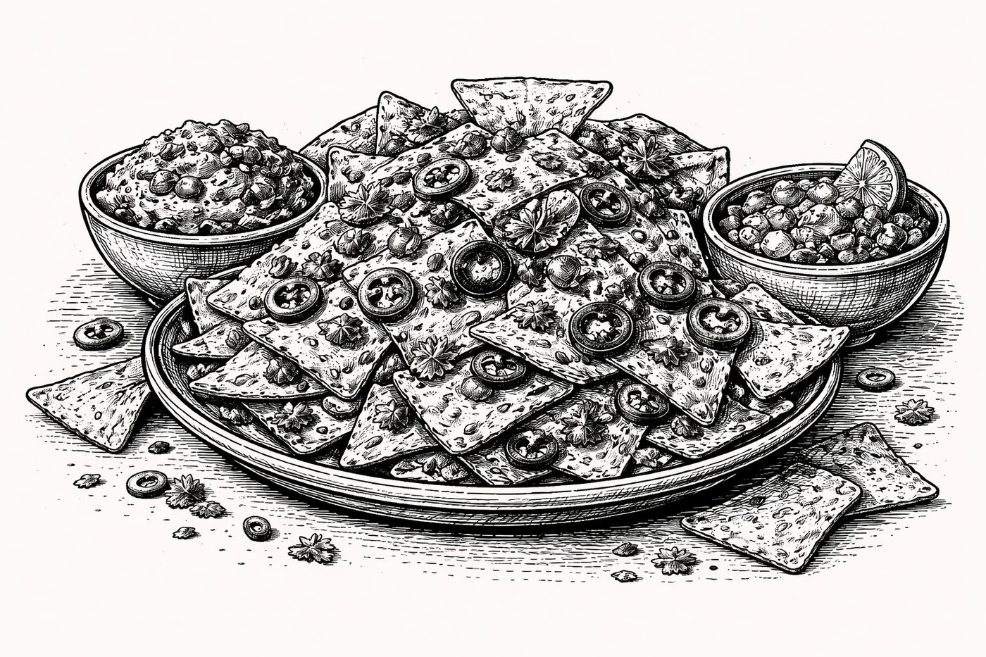 Server nachos med guacamole, sour cream og jalapeños.